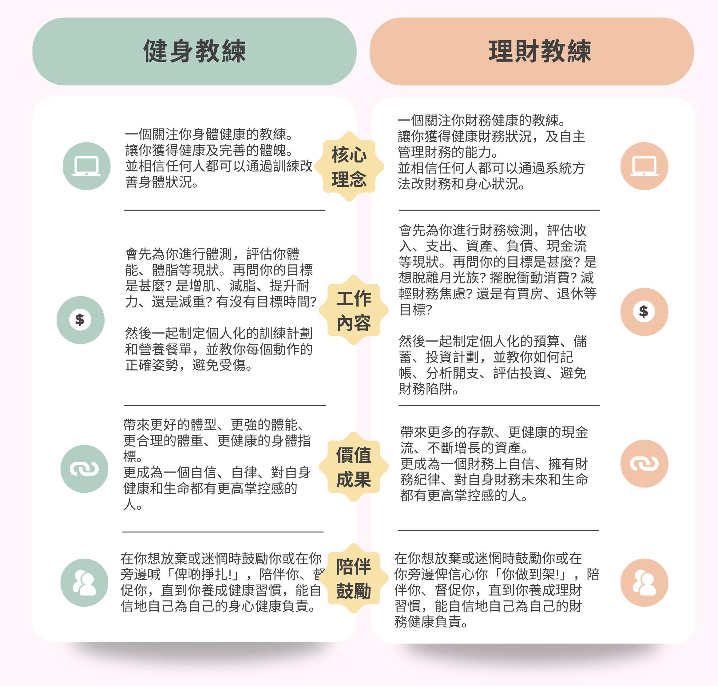 理財教練會和客戶一起探討財務生活的各個方面:價值觀、消費習慣、如何處理金錢,對未來的計劃等等。