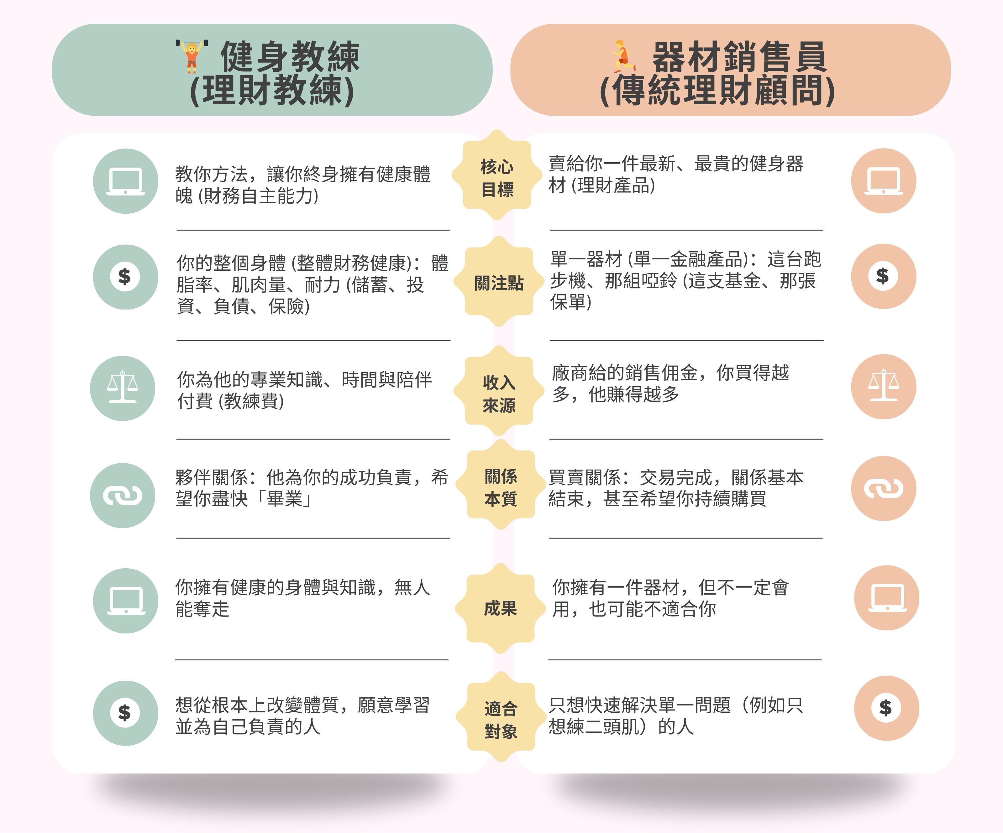 你可以把理財教練想像成一位健身教練——不過他們是在讓你的財務變得更健康,以及達到你的理財目標。